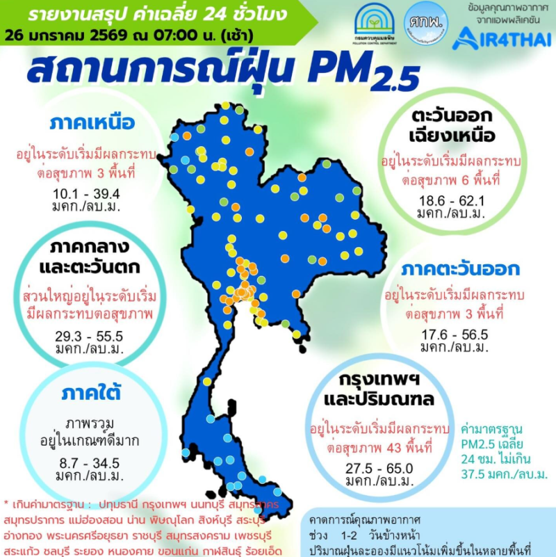 วันที่ 26 ม.ค.2569 ศูนย์สื่อสารการแก้ไขปัญหามลพิษทางอากาศ รายงานการติดตามตรวจสอบคุณภาพอากาศ ประจำวันที่ 26 มกราคม 2569 ณ 07:00 น ฝุ่น PM2.5 วันนี้ ภาพรวมปริมาณ PM2.5 ในประเทศพบเกินค่ามาตรฐานใน