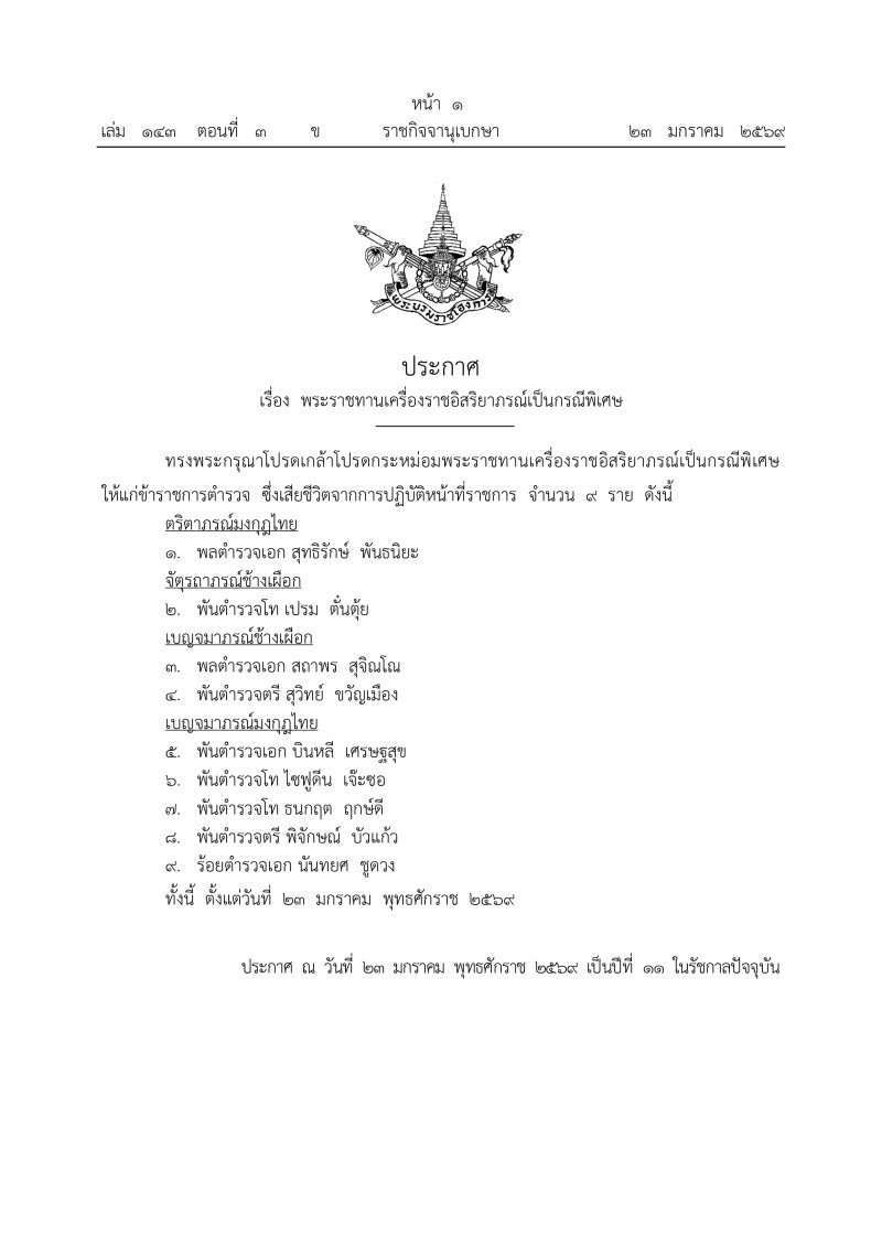 เมื่อวันที่ 26 มกราม 2569 มีรายงานว่า เว็บไซต์ ราชกิจจานุเบกษา ได้เผยเเพร่ ประกาศ เรื่อง พระราชทานเครื่องราชอิสริยาภรณ์เป็นกรณีพิเศษ ทรงพระกรุณาโปรดเกล้าโปรดกระหม่อมพระราชทานเครื่องราชอิสริยาภรณ์เป็นกรณีพิเศษ ให้แก่ข้าราชการตำรวจ ซึ่งเสียชีวิตจากการปฏิบัติหน้าที่ราชการ จำนวน 9 ราย ดังนี้