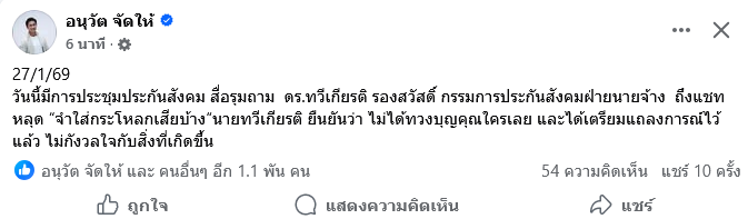 ล่าสุด นายอนุวัต เฟื่องทองแดง ผู้ประกาศข่าวและพิธีกรชื่อดัง ได้ออกมาโพสต์ข้อความผ่านเพจเฟซบุ๊ก อนุวัต จัดให้ โดยระบุว่า วันนี้มีการประชุมประกันสังคม สื่อรุมถาม ดร.ทวีเกียรติ รองสวัสดิ์ กรรมการประกันสังคมฝ่ายนายจ้าง ถึงแชตหลุด จำใส่กระโหลกเสียบ้าง
