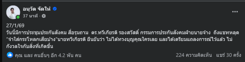อย่างไรก็ตามทาง เพจเฟซบุ๊ก อนุวัต จัดให้ ได้โพสต์ข้อความระบุว่า วันนี้มีการประชุมประกันสังคม สื่อรุมถาม ดร.ทวีเกียรติ รองสวัสดิ์ กรรมการประกันสังคมฝ่ายนายจ้าง ถึงแชทหลุด “จำใส่กระโหลกเสียบ้าง“นายทวีเกียรติ ยืนยันว่า ไม่ได้ทวงบุญคุณใครเลย และได้เตรียมแถลงการณ์ไว้แล้ว ไม่กังวลใจกับสิ่งที่เกิดขึ้น