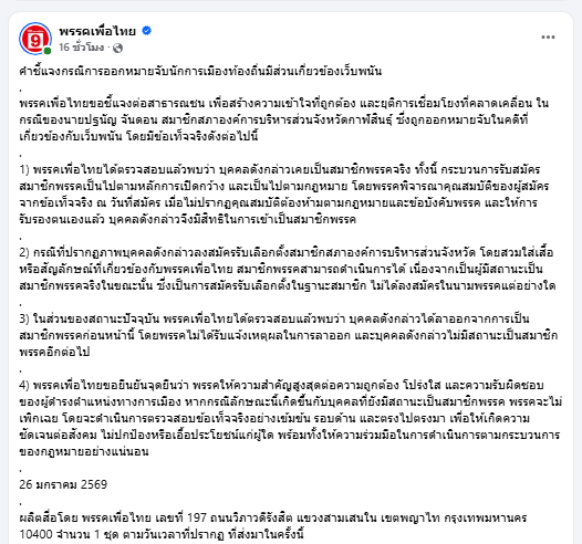 ในวันที่ 26 มกราคม ที่ผ่านมา พรรคเพื่อไทยออกแถลงการณ์ชี้แจง กรณีนักการเมืองท้องถิ่น จ.กาฬสินธุ์ ถูกออกหมายจับคดีเกี่ยวข้องเว็บพนัน พรรคยอมรับตรงไปตรงมาบุคคลดังกล่าว “เคยเป็นสมาชิกพรรคจริง”การรับสมัครเป็นไปตามกฎหมาย ตรวจสอบคุณสมบัติแล้ว ไม่พบลักษณะต้องห้าม ณ วันที่สมัคร