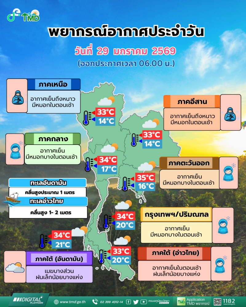 วันที่ 28 ม.ค.2568 กรมอุตุนิยมวิทยา พยากรณ์อากาศ 24 ชั่วโมงข้างหน้า ประเทศไทยมีอากาศเย็นกับมีหมอกบางในตอนเช้า โดยภาคเหนือและภาคตะวันออกเฉียงเหนือยังคงมีอากาศเย็นถึงหนาว เนื่องจากบริเวณความกดอากาศสูงหรือมวลอากาศเย็นกำลังปานกลางปกคลุมที่ประเทศไทยตอนบนมีกำลังอ่อนลง ขอให้ประชาชนดูแลรักษาสุขภาพเนื่องจากสภาพอากาศที่เปลี่ยนแปลง รวมทั้งเพิ่มความระมัดระวังในการสัญจรผ่านบริเวณที่มีหมอกไว้ด้วย