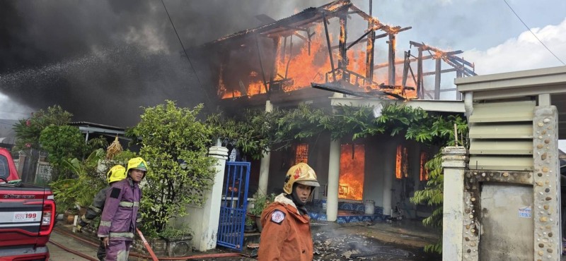 ต่อมาเมื่อเวลา 12.36 น. เจ้าหน้าที่ถึงจุดเกิดเหตุ พบลักษณะเป็น บ้านไม้ 2 ชั้น เพลิงกำลังลุกไหม้อยู่ในตัวอาคาร เจ้าหน้าที่จึงเริ่มดำเนินการควบคุมเพลิงอย่างเร่งด่วน