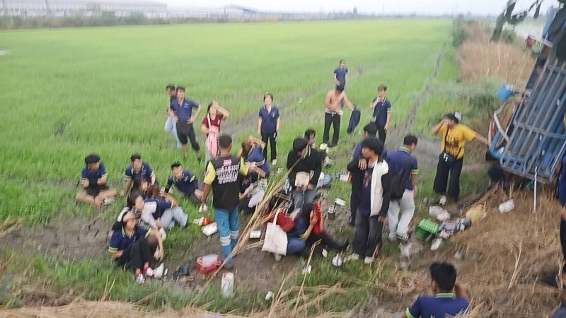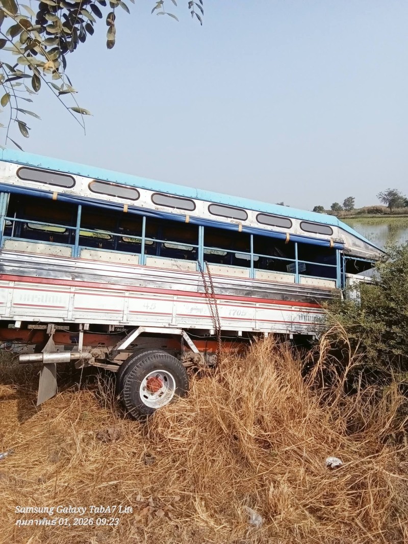 รถสองแถว รับส่งพนักงาน เสียหลักตกลงไปข้างทาง มีผู้ได้รับบาดเจ็บ จำนวนหลายสิบราย (ผู้ได้รับบาดเจ็บ เป็น สัญชาติพม่า)