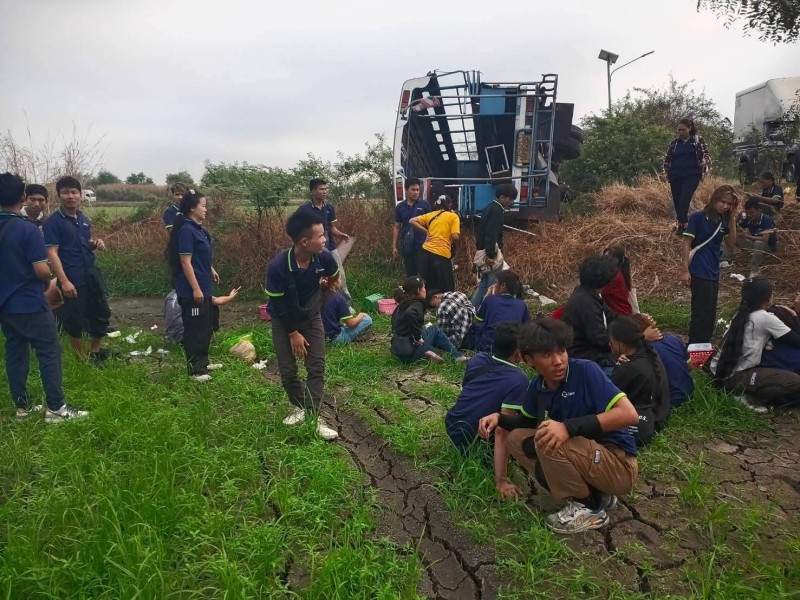 รถสองแถวรับส่งพนักงานพลิกตกข้างทาง วังน้อย เจ็บหลายสิบราย
