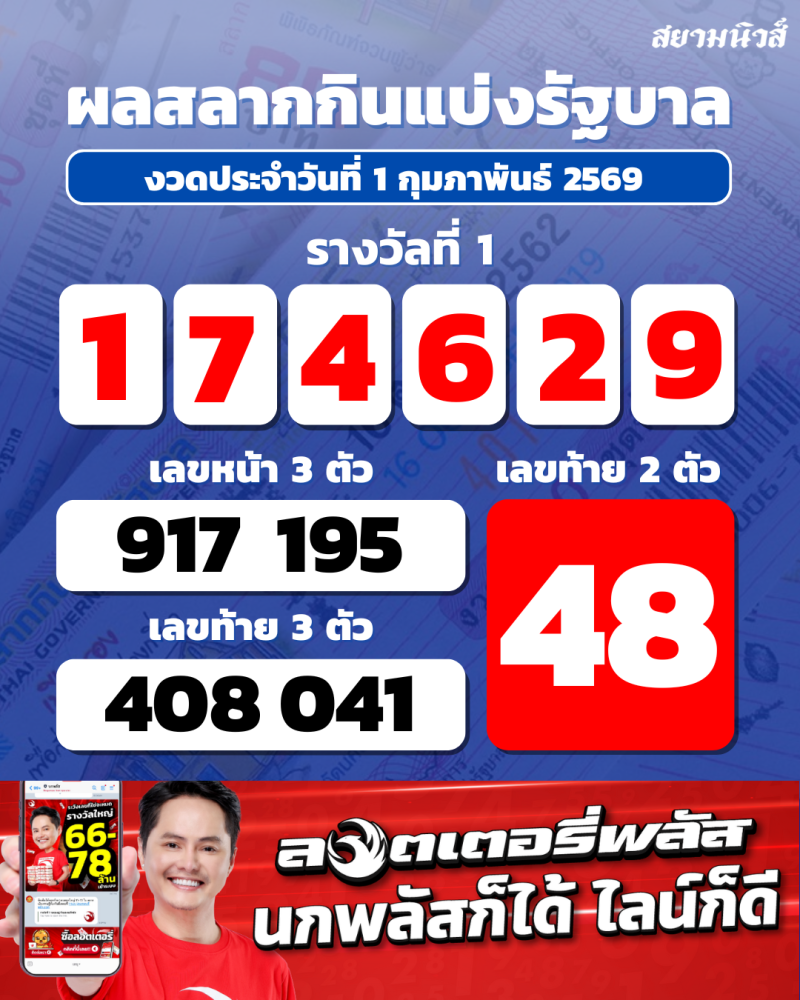 ออกไปเป็นที่เรียบร้อยแล้ว สำหรับการออกรางวัล ประจำวันที่ 1 กุมภาพันธ์ 2569