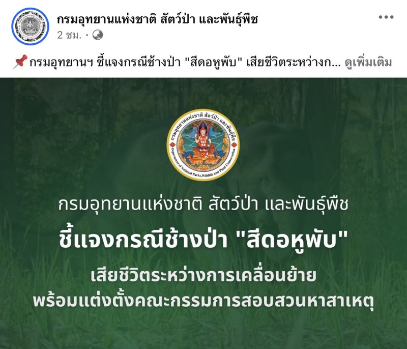 กรมอุทยานแห่งชาติฯ ออกแถลงการณ์ด่วน หลังช้างป่า ‘สีดอหูพับ’ เสียชีวิต ระหว่างการเคลื่อนย้ายจากขอนแก่นไปจังหวัดเลยยืนยันปฏิบัติการครั้งนี้ เป็นไปตามคำสั่งคุ้มครองชั่วคราวของศาลปกครอง เพื่อป้องกันอันตรายต่อประชาชน และอนุรักษ์ชีวิตช้างป่า