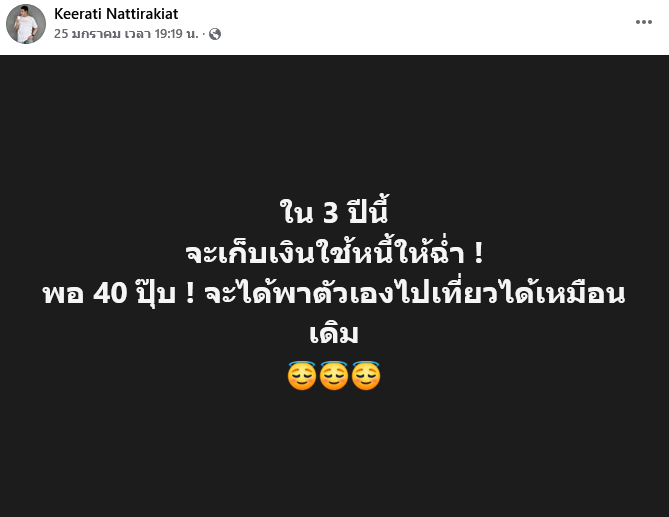 นอกจากนี้ กอล์ฟยังได้โพสต์ข้อความสะท้อนความหวังในชีวิต ระบุว่า ใน 3 ปีนี้ จะเก็บเงินใช้หนี้ให้ฉ่ำ พอ 40 ปุ๊บ จะได้พาตัวเองไปเที่ยวได้เหมือนเดิม
