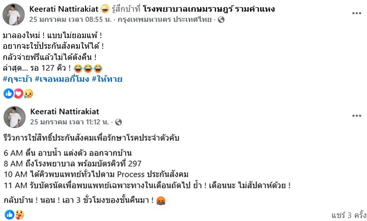 และอีกโพสต์ที่เล่ารายละเอียดตั้งแต่ตื่นเช้า เดินทางไปโรงพยาบาล ไปจนถึงการได้รับเพียงใบนัดแพทย์เฉพาะทางในเดือนถัดไป โดยระบุว่า รีวิวการใช้สิทธิ์ประกันสังคมเพื่อรักษาโรคประจำตัวคับ 6 AM ตื่น อาบน้ำ แต่งตัว ออกจากบ้าน 8 AM ถึงโรงพยาบาล พร้อมบัตรคิวที่ 297 10 AM ได้คิวพบแพทย์ทั่วไปตาม Process ประกันสังคม 11 AM รับบัตรนัดเพื่อพบแพทย์เฉพาะทางในเดือนถัดไป ย้ำ เดือนนะ ไม่สัปดาห์ด้วย กลับบ้าน นอน เอา 3 ชั่วโมงของชั้นคืนมา