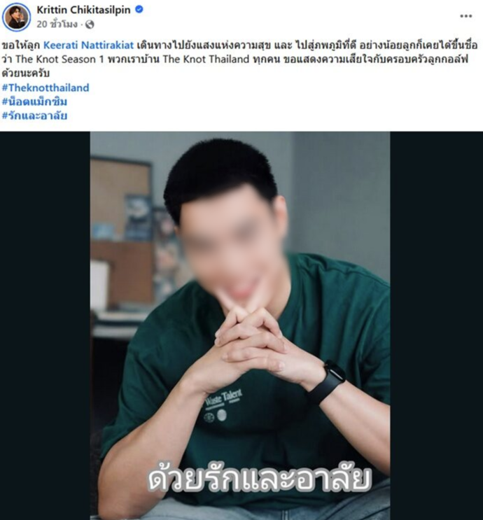 ภายหลังการยืนยันข่าวเศร้า น็อต แม็กซิม หรือ น็อต กฤติน เจ้าของลิขสิทธิ์รายการ The Knot Thailand ได้ออกมาโพสต์แสดงความอาลัยผ่านโซเชียลมีเดีย ระบุข้อความว่า ขอให้ลูก Keerati Nattirakiat เดินทางไปยังแสงแห่งความสุข และไปสู่ภพภูมิที่ดี อย่างน้อยลูกก็เคยได้ขึ้นชื่อว่า The Knot Season 1 พวกเราบ้าน The Knot Thailand ทุกคน ขอแสดงความเสียใจกับครอบครัวลูกกอล์ฟด้วยนะครับ
