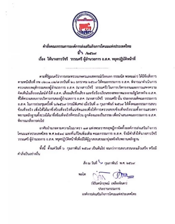เมื่อวันที่ 6 กุมภาพันธ์ 2569 มีรายงานว่า องค์การส่งเสริมกิจการโคนมแห่งประเทศไทย (อ.ส.ค.) ได้ออกประกาศคำสั่งคณะกรรมการองค์การส่งเสริมกิจการโคนมแห่งประเทศไทย (อ.ส.ค.) ที่ 6/2569 ให้ น.ส.วัชรี วรรณศรี ผู้อำนวยการ อ.ส.ค. หยุดปฏิบัติหน้าที่