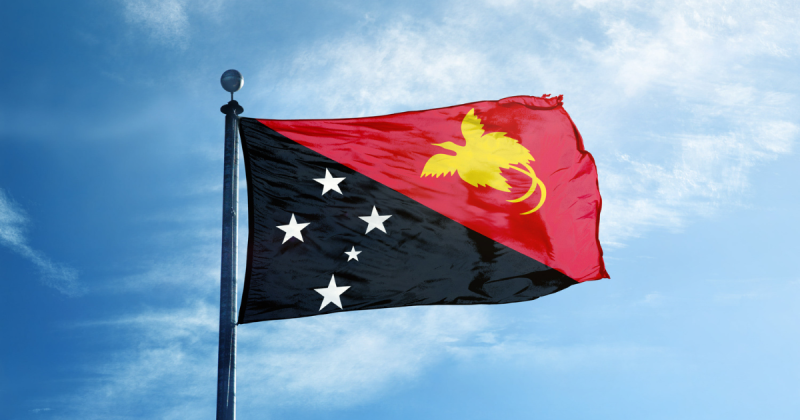 ธงชาติที่มีสีสันที่สุดแห่งหนึ่งในแถบแปซิฟิก แบ่งครึ่งแนวทแยง ด้านบนสีแดงมีภาพนกสวรรค์สีเหลืองเป็นสัญลักษณ์แห่งเสรีภาพและอัตลักษณ์ ด้านล่างสีดำมีดาว 5 ดวงในรูปกลุ่มดาว Southern Cross ซึ่งสื่อถึงตำแหน่งของประเทศในซีกโลกใต้ ธงนี้ออกแบบโดย ซูซาน คารีเก เด็กนักเรียนอายุ 15 ปีที่ชนะการประกวดระดับชาติ และเริ่มใช้ในปี 1971