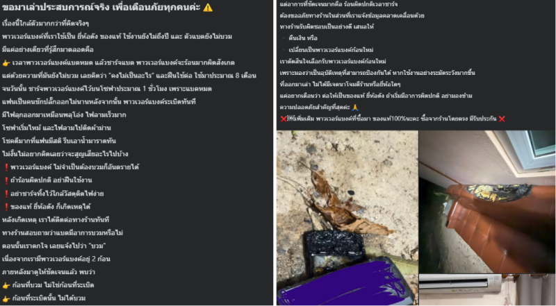 วันที่ 7 กุมภาพันธ์ 2569 ผู้ใช้เฟซบุ๊กรายหนึ่งได้โพสต์ข้อความเล่าประสบการณ์จริงภายในกลุ่ม พวกเราคือผู้บริโภค เพื่อเตือนภัยประชาชน หลังเกิดเหตุพาวเวอร์แบงค์ระเบิดภายในบ้าน แม้จะเป็นสินค้าของแท้จากแบรนด์ดัง และยังอยู่ในระยะรับประกัน