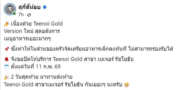 เมื่อวันที่ 9 กุมภาพันธ์ 2569 ที่ผ่านมา เพจเฟซบุ๊ก สุกี้ตี๋น้อย มีการประกาศเรื่องการปิดสาขา รายละเอียดทั้งหมด ดังนี้ เนื่องด้วย Teenoi Gold Version ใหม่ สุดอลังการ เมนูอาหารเยอะมาก ๆ ซึ่งทำให้ในส่วนของครัวจัดเตรียมอาหารเล็กลงทันที ไม่สามารถรองรับได้ จึงขอปิดให้บริการ Teenoi Gold สาขา เมเจอร์ รัชโยธิน ตั้งแต่วันที่ 11 ก.พ. 69 2 วันสุดท้าย มาทานส่งท้าย Teenoi Gold สาขาเมเจอร์ รัชโยธิน กันเยอะ ๆ นะครับ