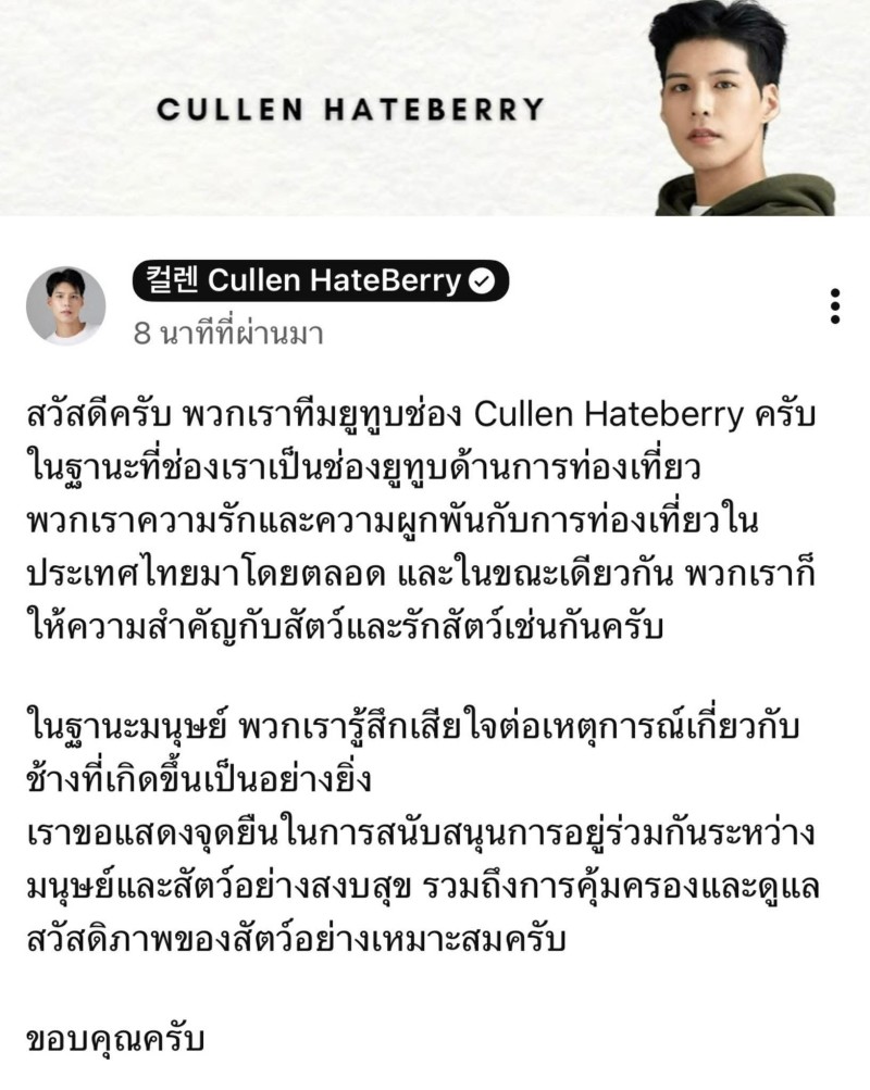 โดยประกาศจากช่อง ว่าในฐานะที่ช่องเป็นช่องที่เกี่ยวกับยูทูปด้านการท่องเที่ยวพวกเราความรักและความผูกพันกับการท่องเที่ยวในประเทศไทยมาโดยตลอด และในขณะเดียวกัน พวกเราก็ให้ความสำคัญกับสัตว์และรักสัตว์เช่นกัน ในฐานะมนุษย์ พวกเรารู้สึกเสียใจต่อเหตุการณ์เกี่ยวกับช้างที่เกิดขึ้นเป็นอย่างยิ่ง ขอแสดงจุดยทนในการสนับสนุนการอยู่ร่วมกันระหว่างมนุษย์และสัตว์อย่างสงบสุข รวมถึงการคุ้มครองและดูแลสวัสดิภาพของสัตว์อย่างเหมาะสม