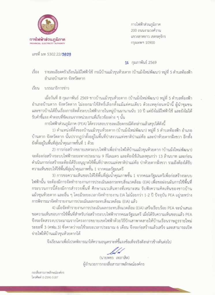 ล่าสุด 11 กุมภาพันธ์ 2569 การไฟฟ้าส่วนภูมิภาค (PEA) ชี้แจงว่า พื้นที่ตั้งของบ้านแม้วขุนห้วยตาก (บ้านม้งใหม่พัฒนา) หมู่ที่ 5 ตำบลท้องฟ้า อำเภอบ้านตาก จังหวัดตาก อยู่ในเขตป่าสงวนแห่งชาติป่าแม่ท้อ และป่าห้วยตากฝั่งขวา อีกทั้งยังอยู่ในพื้นที่ลุ่มน้ำคุณภาพชั้นที่ 1 ซึ่งเป็นพื้นที่ที่มีข้อจำกัดด้านการใช้ประโยชน์อย่างเข้มงวด