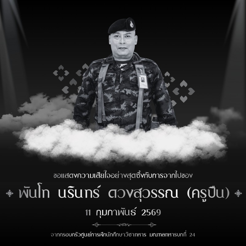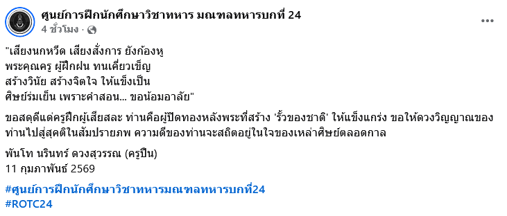 เมื่อวันที่ 12 กุมภาพันธ์ 2569 มีรายงานว่า ศูนย์ประชาสัมพันธ์ศูนย์การฝึกนักศึกษาวิชาทหาร มณฑลทหารบกที่ 24 ได้ประกาศเเจ้งข่าวเศร้า ผ่านเพจเฟซบุ๊ก ศูนย์การฝึกนักศึกษาวิชาทหาร มณฑลทหารบกที่ 24 โดยระบุว่า เสียงนกหวีด เสียงสั่งการ ยังก้องหู พระคุณครู ผู้ฝึกฝน ทนเคี่ยวเข็ญ สร้างวินัย สร้างจิตใจ ให้แข็งเป็น ศิษย์ร่มเย็น เพราะคำสอน ขอน้อมอาลัย