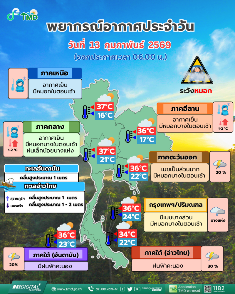 วันที่ 13 ก.พ. 2568 กรมอุตุนิยมวิทยา พยากรณ์อากาศ 24 ชั่วโมงข้างหน้า ประเทศไทยตอนบนมีอุณหภูมิสูงขึ้นกับมีหมอกในตอนเช้า โดยภาคเหนือและภาคตะวันออกเฉียงเหนือมีอากาศเย็นในตอนเช้า เนื่องจากบริเวณความกดอากาศสูงหรือมวลอากาศเย็นที่ปกคลุมประเทศไทยตอนบน มีกำลังอ่อน ในขณะที่ลมตะวันออกเฉียงใต้พัดนำความชื้นจากอ่าวไทยปกคลุมภาคกลาง กรุงเทพมหานครรวมทั้งปริมณฑล และภาคตะวันออกทำให้บริเวณดังกล่าวมีฝนฟ้าคะนองเกิดขึ้นได้ ขอให้ประชาชนบริเวณประเทศไทยตอนบนดูแลรักษาสุขภาพเนื่องจากสภาพอากาศที่เปลี่ยนแปลง และระมัดระวังในการสัญจรผ่านบริเวณที่มีหมอกไว้ด้วย