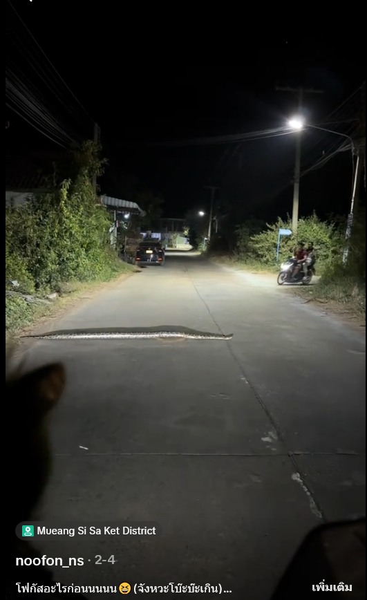 ผู้ใช้ TikTok รายหนึ่งโพสต์คลิปเหตุการณ์ชวนลุ้นระทึก เมื่อขับรถเลี้ยวเข้าซอยแล้วต้องชะงัก เพราะเจองูตัวใหญ่เลื้อยขวางอยู่กลางถนน ทำเอาต้องหยุดรถรอ ไม่กล้าขับฝ่า หวั่นสัตว์เลื้อยคลานได้รับอันตราย