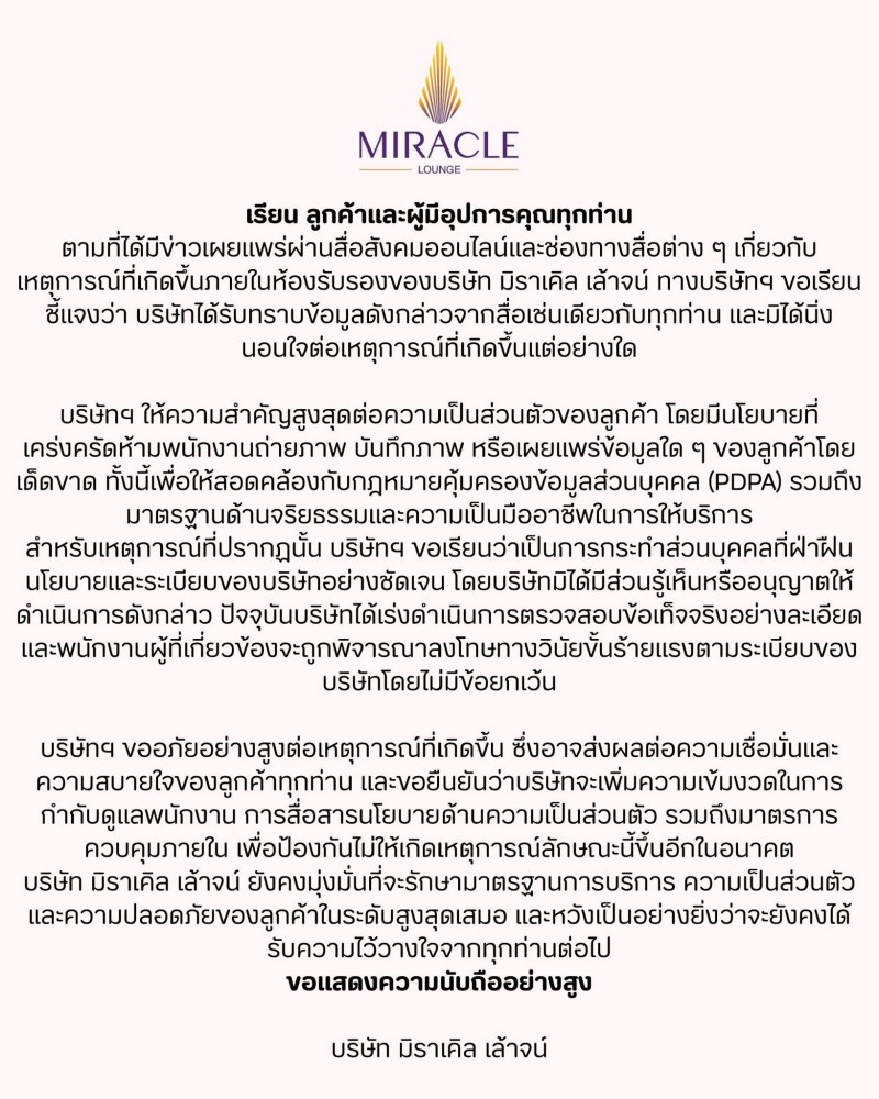 เมื่อวันที่ 14 กุมภาพันธ์ 2569 ที่ผ่านมา เพจเฟซบุ๊ก Miracle Longe ออกแถลงการณ์ เรียนลูกค้าและผู้มีอุปการคุณทุกท่าน ตามที่ได้มีข่าวเผยแพร่ผ่านสื่อสังคมออนไลน์และช่องทางสื่อต่างๆ เกี่ยวกับเหตุการณ์ที่เกิดขึ้นภายในห้องรับรองของบริษัท มิราเคล เล้าจน์ ทางบริษัทฯ ขอเรียนชี้แจงว่า บริษัทได้รับทราบข้อมูลดังกล่าวจากสื่อเช่นเดียวกับทุกท่าน และมิได้นิ่งนอนใจต่อเหตุการณ์ที่เกิดขึ้นแต่อย่างใด