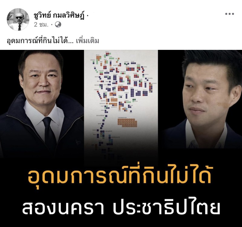 ล่าสุด ในวันที่ 15 กุมภาพันธ์ นาย ชูวิทย์ กมลวิศิษฎ์ อดีตนักการเมืองชื่อดัง โพสต์วิจารณ์การเมืองหลังเลือกตั้งแบบไม่ไว้หน้า ชูวิทย์ชี้ว่า ความพ่ายแพ้ของ “พรรคส้ม” ไม่เกินคาด เพราะหลงกระแสโซเชียลแต่ไม่เข้าใจชีวิตคนในโลกความจริง โดยเฉพาะในชนบท