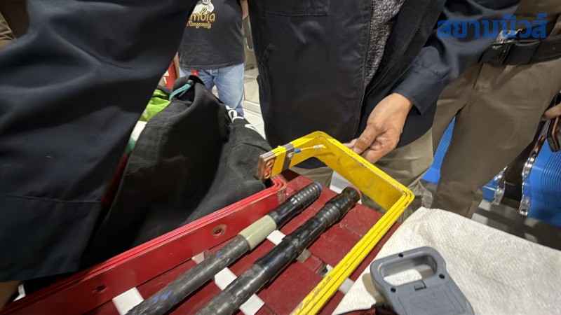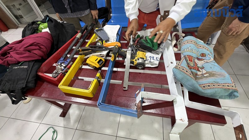 จากการตรวจค้นตัวไม่พบสิ่งของผิดกฎหมาย แต่เมื่อค้นรถจักรยานยนต์ พบของกลางหลายรายการ ประกอบด้วย สะพานไฟ 12 ชิ้น ไฟฉาย 2 ชิ้น คีมตัดสายไฟ คัตเตอร์ ไขควง บล็อกถอนน็อตไร้สาย เครื่องชั่งน้ำหนัก เลื่อยตัดเหล็กพบอยู่ภายในถุงผ้าสีดำใต้รถจักรยานยนต์