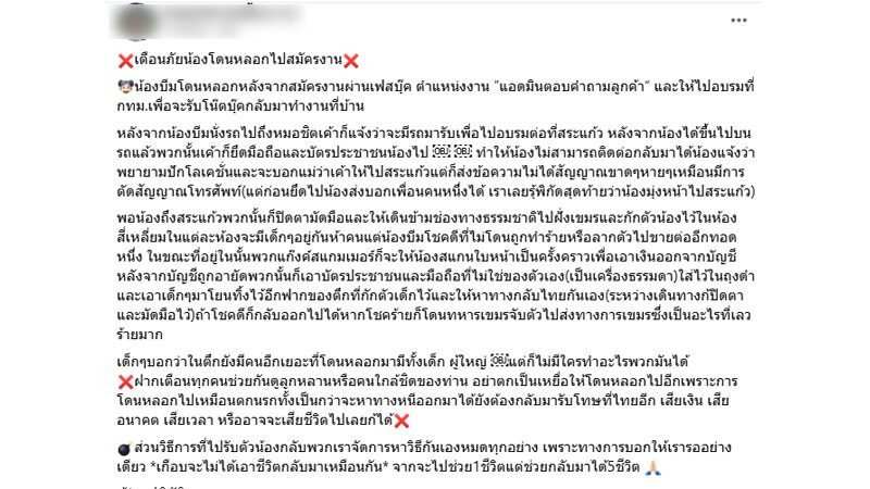 ผู้โพสต์ระบุว่า น้องถูกชักชวนให้ไปอบรมงานที่กรุงเทพฯ เพื่อรับโน้ตบุ๊กกลับมาทำงานที่บ้าน เมื่อเดินทางไปถึงหมอชิต ทางกลุ่มผู้ก่อเหตุแจ้งว่าจะมีรถมารับไปอบรมต่อที่จังหวัดสระแก้ว แต่หลังจากขึ้นรถแล้ว กลับถูกยึดโทรศัพท์มือถือและบัตรประชาชน ทำให้ไม่สามารถติดต่อใครได้