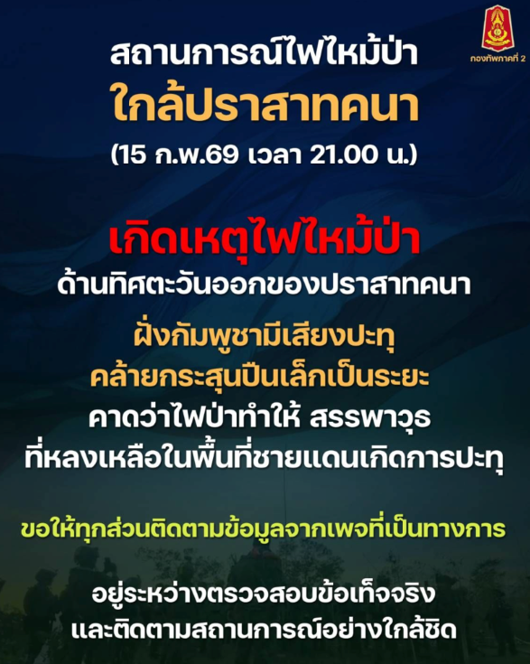 เมื่อช่วงค่ำวันที่ 15 กุมภาพันธ์ เกิด ไฟไหม้ป่า ด้านทิศตะวันออกของ ปราสาทคนา ฝั่งกัมพูชาระหว่างเกิดไฟไหม้ มีเสียงปะทุเป็นระยะคล้ายเสียงปืนเล็ก แต่เบื้องต้นคาดว่า เกิดจาก สรรพาวุธตกค้างในพื้นที่ชายแดน ที่ได้รับความร้อนจนเกิดการปะทุ ไม่ใช่การยิงโจมตี ขณะนี้อยู่ระหว่าง ตรวจสอบข้อเท็จจริงอย่างละเอียดพร้อมขอประชาชน ติดตามข้อมูลจากแหล่งทางการ และอย่าตื่นตระหนก