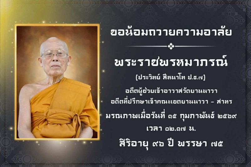 เพจเฟซบุ๊ก วัดยานนาวา พระอารามหลวง ได้โพสต์แจ้งการมรณภาพของพระราชพรหมาภรณ์ (ประวิทย์ สีหนาโท ป.ธ.7) ผู้ช่วยเจ้าอาวาสวัดยานนาวา ที่ปรึกษาเจ้าคณะเขตยานนาวา-สาทร ได้ถึงมรณภาพด้วยอาการสงบ เมื่อวันที่ 15 ก.พ. 2569 เวลา 02.17 น. ที่โรงพยาบาลจุฬาลงกรณ์ สิริอายุ 96 ปี 75 พรรษา