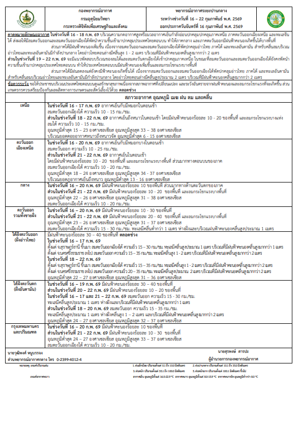 คาดหมายอากาศรายภาค 16 - 22 กุมภาพันธ์ พ.ศ. 2569