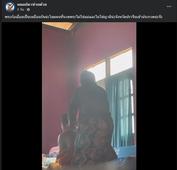 จากกรณีที่ก่อนหน้านี้ เพจเฟซบุ๊ก หมอปลาช่วยด้วย ได้โพสต์คลิปพระสูงอายุกำลังให้สีกาผู้หญิงสูงอายุรายหนึ่ง สีกานวดบ่าหลังไหล่ใกล้ๆ ยังพบมีพระอีกรูปหนึ่งอยู่ด้วย พร้อมข้อความระบุว่า “พระก้อเมื่อยเป็นเหมือนกันน่ะโยม คนที่นวดพระไม่ใช่แม่และไม่ใช่ญาติน่ะ จังหวัดปราจีนเข้าประกวดน่ะจ๊ะ”