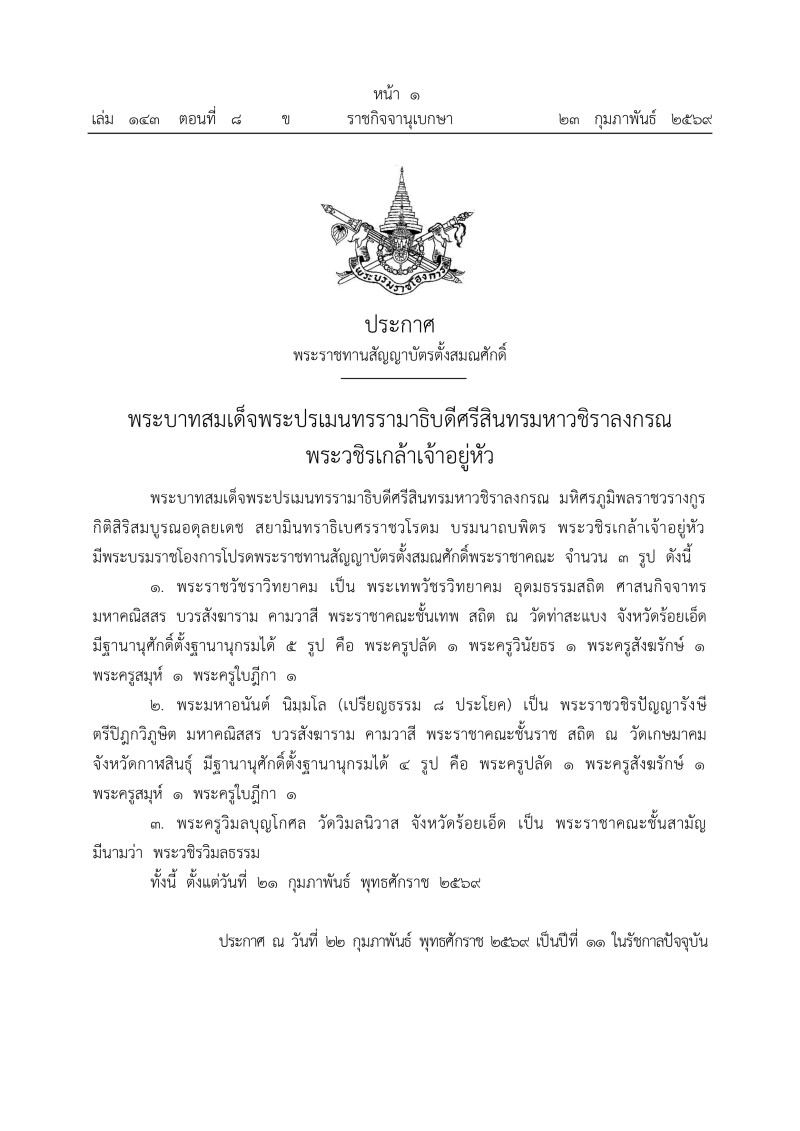 เมื่อวันที่ 23 กุมภาพันธ์ 2569 มีรายงานว่า เว็บไซต์ ราชกิจจานุเบกษา ได้เผยเเพร่ประกาศ พระราชทานสัญญาบัตรตั้งสมณศักดิ์ พระบาทสมเด็จพระปรเมนทรรามาธิบดีศรีสินทรมหาวชิราลงกรณ มหิศรภูมิพลราชวรางกูร กิติสิริสมบูรณอดลยเดช สยามินทราธิเบศรรราชวโรดม บรมนาถบพิตร พระวชิรเกล้าเจ้าอยู่หัว มีพระบรมราชโองการโปรดพระราชทานสัญญาบัตรตั้งสมณศักดิ์พระราชาคณะ จำนวน 3 รูป ดังนี้