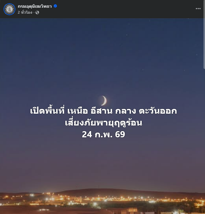 วันที่ 24 กุมภาพันธ์ 2569 กรมอุตุนิยมวิทยา รายงานว่า พยากรณ์อากาศ 24 ชั่วโมงข้างหน้า ระบุว่า ประเทศไทยตอนบนมีพายุฤดูร้อนเกิดขึ้น โดยมีลักษณะของพายุฝนฟ้าคะนอง ลมกระโชกแรง ลูกเห็บตก และฝนตกหนักบางแห่ง รวมถึงฟ้าผ่าที่อาจเกิดขึ้นได้บางพื้นที่