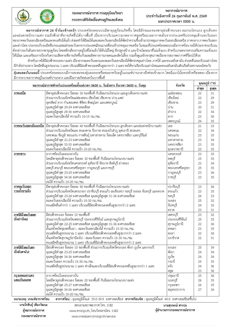 สำหรับภาคใต้ยังคงมีฝนฟ้าคะนองบางแห่ง เนื่องจากมีลมตะวันออกและลมตะวันออกเฉียงใต้ที่พัดปกคลุมอ่าวไทย ภาคใต้ และทะเลอันดามัน สำหรับคลื่นลมบริเวณอ่าวไทยและทะเลอันดามันมีกำลังอ่อนลง โดยอ่าวไทยมีคลื่นสูงประมาณ 1 เมตร บริเวณที่มีฝนฟ้าคะนองคลื่นสูงมากกว่า 2 เมตร ข้อควรระวัง: ในช่วงวันที่ 24 – 25 ก.พ. 69 ขอให้ประชาชนบริเวณประเทศไทยตอนบนระมัดระวังอันตรายจากพายุฝนฟ้าคะนอง ลมกระโชกแรง ลูกเห็บตก และฟ้าผ่า โดยหลีกเลี่ยงการอยู่ในที่โล่งแจ้ง ใต้ต้นไม้ใหญ่ และป้ายโฆษณาที่ไม่แข็งแรง รวมทั้งหลีกเลี่ยงการเดินทางผ่านบริเวณที่มีพายุฝนฟ้าคะนอง ที่จะเกิดขึ้นในระยะนี้ สำหรับเกษตรกรควรเสริมความแข็งแรงให้ไม้ผล และเตรียมการป้องกันความเสียหายที่อาจเกิดขึ้น กับผลผลิตทางการเกษตรและสัตว์เลี้ยง รวมทั้งดูแลรักษาสุขภาพในช่วงที่สภาพอากาศเปลี่ยนแปลงไว้ด้วย