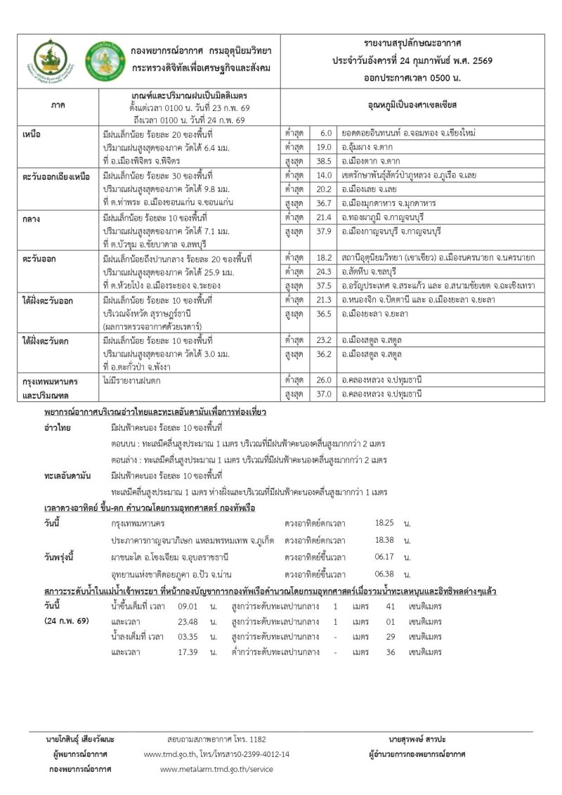 พยากรณ์อากาศ 7 วันข้างหน้า: ในช่วงวันที่ 24 – 25 ก.พ. 69 ประเทศไทยตอนบนมีพายุฤดูร้อนเกิดขึ้น โดยจะมีลักษณะของพายุฝนฟ้าคะนอง ลมกระโชกแรง ฟ้าผ่า ลูกเห็บตก และฝนตกหนักบางแห่ง หลังจากนั้นอากาศจะคลายความร้อนลง ทั้งนี้เนื่องจากมีบริเวณความกดอากาศสูงหรือมวลอากาศเย็นจากประเทศจีนเคลื่อนเข้าปกคลุมภาคตะวันออกเฉียงเหนือและทะเลจีนใต้ ส่งผลทำให้มีลมใต้และลมตะวันออกเฉียงใต้พัดนำความชื้นเข้าปกคลุมภาคตะวันออกเฉียงเหนือ ภาคกลาง ภาคตะวันออก และอ่าวไทย ประกอบกับมีคลื่นกระแสลมฝ่ายตะวันตกเคลื่อนผ่านภาคเหนือและภาคตะวันออกเฉียงเหนือในขณะที่ประเทศไทยตอนบนมีอากาศร้อน สำหรับภาคใต้มีฝนฟ้าคะนองบางแห่ง เนื่องจากลมตะวันออกและลมตะวันออกเฉียงใต้พัดปกคลุมอ่าวไทย ภาคใต้ และทะเลอันดามัน บริเวณอ่าวไทยและห่างฝั่งทะเลอันดามันมีคลื่นสูงประมาณ 1 เมตร บริเวณที่มีฝนฟ้าคะนองคลื่นสูงมากกว่า 1 เมตร