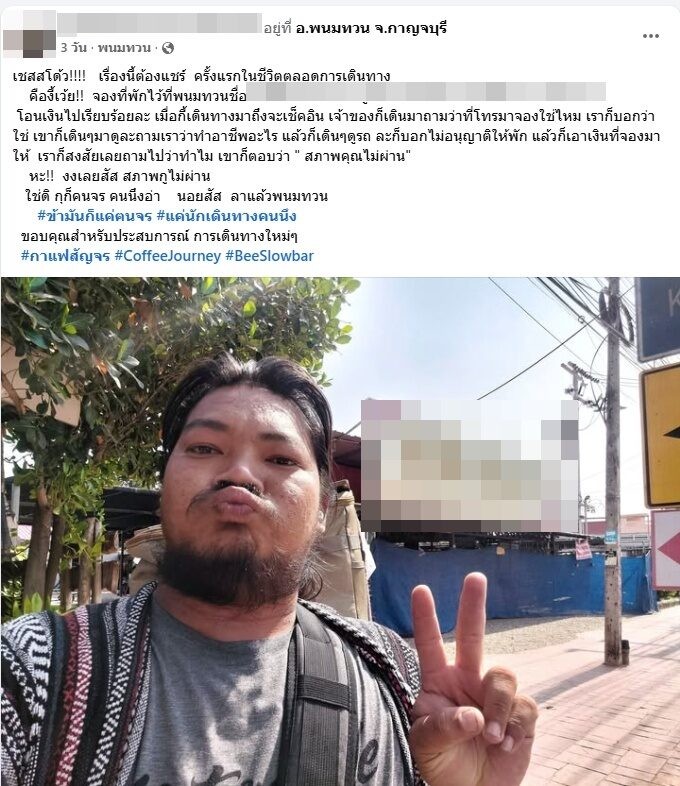 วันที่ 25 ก.พ.69 สมาชิกเฟซบุ๊กรายหนึ่ง ซึ่งมีอาชีพเปิดร้านกาแฟสัญจร โพสต์ตัดพ้อ หลังรีสอร์ตแห่งหนึ่งใน จ.กาญจนบุรีไม่ให้เข้าพัก ทั้งที่โอนเงินไปเรียบร้อยแล้ว เพราะสภาพไม่ผ่าน โดยระบุว่า เชสสโด้ว!!!! เรื่องนี้ต้องแชร์ ครั้งแรกในชีวิตตลอดการเดินทาง คืองี้เว้ย!! จองที่พักไว้ที่พนมทวนชื่อ …รีสอร์ท โอนเงินไปเรียบร้อยละ เมื่อกี้เดินทางมาถึงจะเช็คอิน เจ้าของก็เดินมาถามว่าที่โทรมาจองใช่ไหม เราก็บอกว่าใช่ เขาก็เดินๆ มาดูละถามเราว่าทำอาชีพอะไร แล้วก็เดินๆ ดูรถ ละก็บอกไม่อนุญาตให้พัก แล้วก็เอาเงินที่จองมาให้ เราก็สงสัยเลยถามไปว่าทำไม เขาก็ตอบว่า สภาพคุณไม่ผ่าน