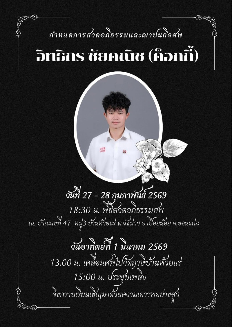ส่วนสาเหตุที่เสียชีวิต เป็นเพราะ อิทธิกร ประสบอุบัติเหตุรถชน แพทย์พยายามยื้อชีวิตอย่างสุดความสามารถ