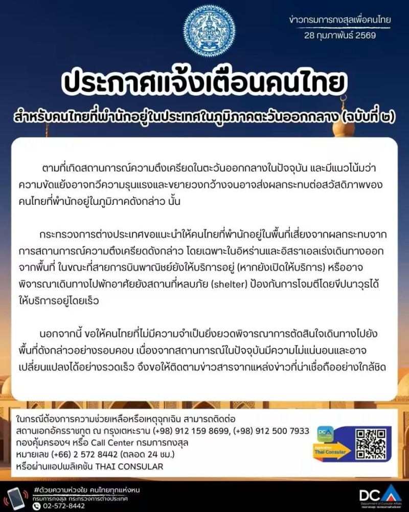 เมื่อวันนี้ 28 กุมภาพันธ์ 2569 กระทรวงการต่างประเทศ ออกประกาศแจ้งเตือนคนไทยในภูมิภาคตะวันออกกลาง ท่ามกลางสถานการณ์ความตึงเครียดที่มีแนวโน้มทวีความรุนแรง และอาจส่งผลกระทบต่อความปลอดภัยของประชาชนไทยที่พำนักอยู่ในพื้นที่ โดยเฉพาะใน อิหร่าน และ อิสราเอล