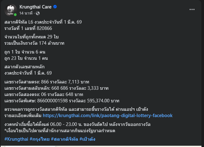 ล่าสุด Krungthai Care ได้โพสต์ข้อความระบุว่า สลากดิจิทัล L6 งวดประจำวันที่ 1 มี.ค. 69