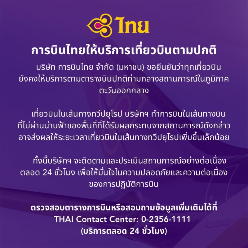 เนื่องจากสถานการณ์ความไม่สงบในบางพื้นที่ของตะวันออกกลาง บริษัท การบินไทย จำกัด (มหาชน) ขอยืนยันว่าเที่ยวบินทั้งหมดจะยังคงให้บริการตามตารางเวลาปกติ