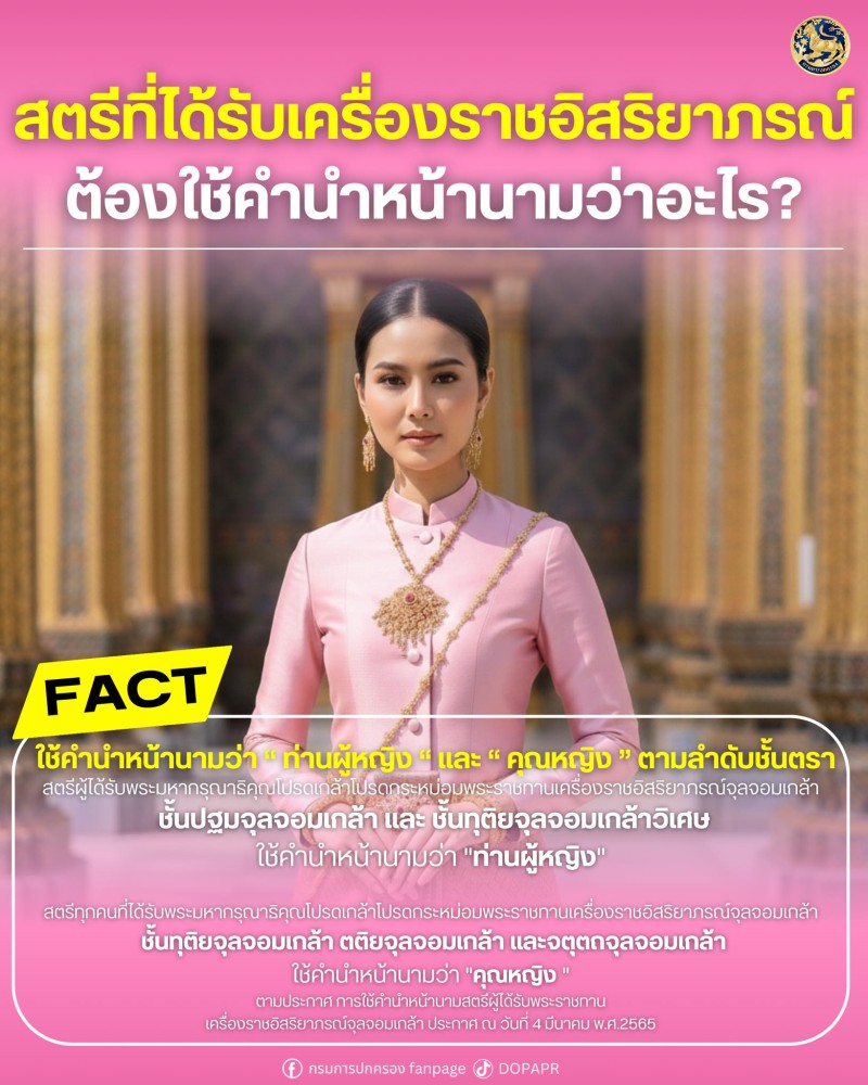 เมื่อวันที่ 3 มีนาคม 2569 มีรายงานว่ากรมการปกครอง กระทรวงมหาดไทย เผยแพร่ข้อมูลเกี่ยวกับการใช้คำนำหน้านาม ผ่านช่องทางเพจเฟซบุ๊ก กรมการปกครอง fanpage โดยระบุว่า สตรีที่ได้รับเครื่องราชอิสริยาภรณ์ ต้องใช้คำนำหน้านามว่าอะไร ใช้คำนำหน้านามว่า ท่านผู้หญิง และ คุณหญิง ตามลำดับชั้นตรา