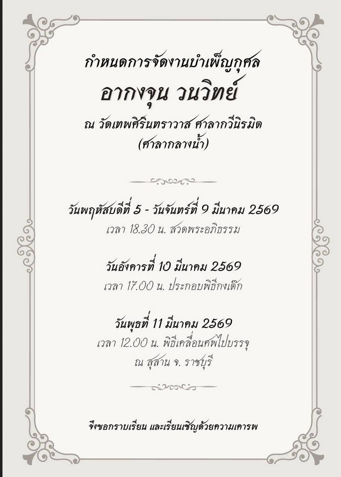 อากงจุนท่านได้เสียชีวิตลงแล้วอย่างสงบ เมื่อวันที่ 5 มีนาคม 2569 สิริอายุ 89 ปี
