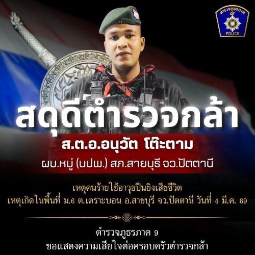 วันที่ 5 มีนาคม 2569 ที่ผ่านมา เพจเฟซบุ๊ก ตำรวจภูธรภาค 9 รายงานระบุว่า สดุดีตำรวจกล้า ส.ต.อ.อนุวัต โต๊ะตาม ผบ.หมู่ (นปพ.) สภ.สายบุรี จว.ปัตตานี เหตุคนร้ายใช้อาวุธปืนยิงเสียชีวิต เหตุเกิดในพื้นที่ ม.6 ต.เตราะบอน อ.สายบุรี จว.ปัตตานี วันที่ 4 มี.ค. 69