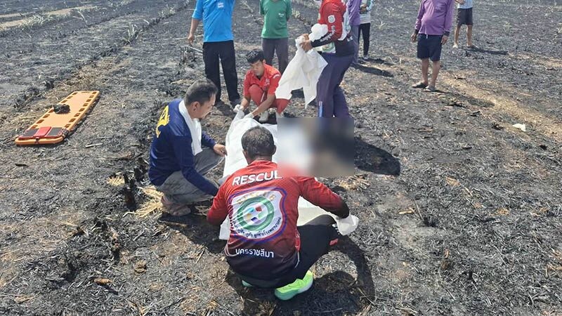 ที่เกิดเหตุ เป็นไร่อ้อยมีร่องรอยการเผาหญ้าและวัชพืช พบศพนายสุพจน์ (สงวนนามสกุล) อายุ 61 ปี ชาวบ้านหมู่ 2 ต.ขามสมบูรณ์ สภาพศพนอนคว่ำหน้า ตามร่างกายมีร่องรอยถูกไฟไหม้