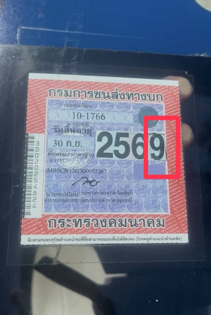 นอกจากนี้ เจ้าหน้าที่ยังพบความผิดปกติที่แผ่นป้ายภาษีหน้ารถ มีการตัดตัวเลขมาแปะทับเพื่อให้ดูเหมือนว่ายังไม่หมดอายุ ทั้งที่ภาษีสิ้นอายุไปแล้วหลายปี ผู้ขับขี่ยอมรับว่าเป็นผู้แก้ไขแผ่นป้ายเอง