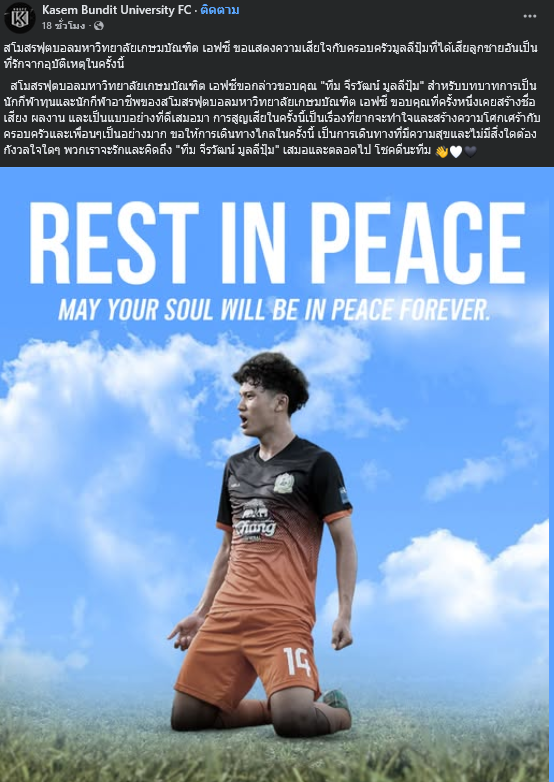 นอกจากนี้ ทางเพจ Kasem Bundit University FC ก็ได้ออกมาโพสต์ข้อความแสดงความอาลัยเช่นเดียวกัน โดยระบุว่า สโมสรฟุตบอลมหาวิทยาลัยเกษมบัณฑิต เอฟซี ขอแสดงความเสียใจกับครอบครัวมูลลีปุ้มที่ได้เสียลูกชายอันเป็นที่รักจากอุบัติเหตุในครั้งนี้ พร้อมขอกล่าวขอบคุณ ทีม จีรวัฒน์ มูลลีปุ้ม สำหรับบทบาทการเป็นนักกีฬาทุนและนักกีฬาอาชีพของสโมสรฟุตบอลมหาวิทยาลัยเกษมบัณฑิต เอฟซ