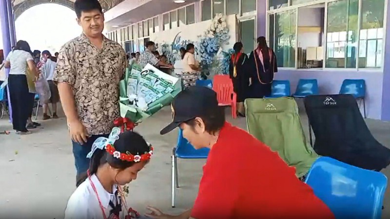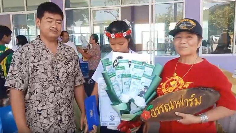 วันที่ 12 มีนาคม 2569 ที่โรงเรียนอนุบาลบ้านท่าพระยาจักร อำเภออู่ทอง จังหวัดสุพรรณบุรี บรรยากาศงานปัจฉิมนิเทศ มีคุณย่าวรรณา วัย 54 ปี เจ้าของวรรณาฟาร์ม (ฟาร์มเลี้ยงไก่เนื้อ) อำเภอเลาขวัญ จังหวัดกาญจนบุรี ซึ่งเป็นย่าของน้องออม เด็กหญิงณัชชา ทองยิ้ม จัดหนักเซอร์ไพรส์ น้องออม หลานสาวหัวแก้วหัวแหวนเพียงคนเดียว ด้วยโฉนดที่ดิน 2 แปลง จำนวน 21 ไร่ นำใบโฉนดที่ดินมาทำเป็นพวงมาลัย ติดเงินสดอีก 2,000 บาท มาคล้องคอมอบเป็นของขวัญ แสดงความยินดีให้น้องออมหลานสาวที่เรียนจบชั้น ป.6 พร้อมกับได้จ้างรถแห่ มาเปิดเพลงฉลองให้หลานสาวและเพื่อนๆ ร่วมสร้างสีสันในงานปัจฉิมนิเทศของโรงเรียน
