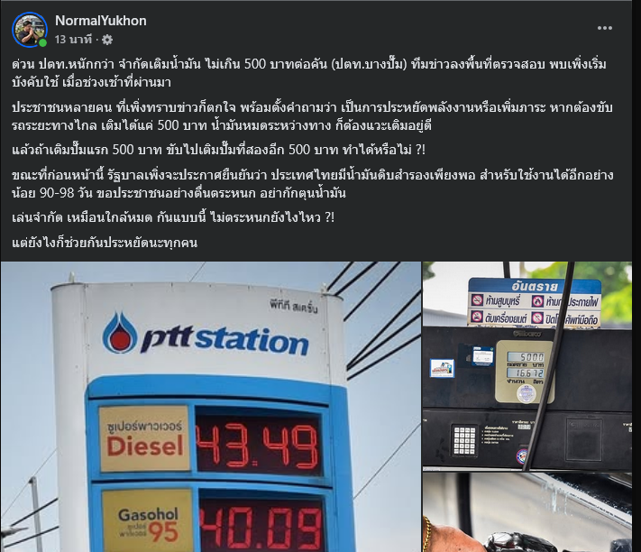 วันที่ 14 มีนาคม 2569 มีรายงานว่า เพจเฟซบุ๊ก NormalYukhon ได้โพสต์ข้อความระบุว่า ด่วน ปตท.หนักกว่า จำกัดเติมน้ำมัน ไม่เกิน 500 บาทต่อคัน (ปตท.บางปั๊ม) ทีมข่าวลงพื้นที่ตรวจสอบ พบเพิ่งเริ่มบังคับใช้ เมื่อช่วงเช้าที่ผ่านมา