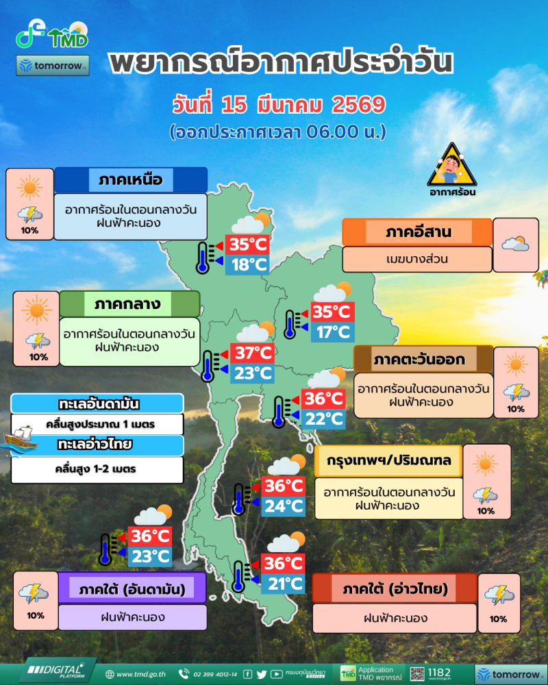 วันที่ 15 มีนาคม 2569 กรมอุตุนิยมวิทยา พยากรณ์อากาศ 24 ชั่วโมงข้างหน้า ประเทศไทยตอนบนมีอากาศร้อนในตอนกลางวัน แต่ยังคงมีฝนฟ้าคะนองบางแห่ง บริเวณภาคเหนือ ภาคกลางตอนล่าง และภาคตะวันออก เนื่องจากบริเวณความกดอากาศสูงหรือมวลอากาศเย็นกำลังปานกลางจากประเทศจีนยังคงปกคลุมภาคตะวันออกเฉียงเหนือ และทะเลจีนใต้ ส่งผลทำให้มีลมตะวันออกและลมตะวันออกเฉียงใต้พัดปกคลุมประเทศไทยตอนบน ขอให้ประชาชนบริเวณดังกล่าว ระวังอันตรายจากฝนฟ้าคะนอง รวมทั้งดูแลรักษาสุขภาพเนื่องจากสภาพอากาศที่ร้อนขึ้นไว้ด้วย