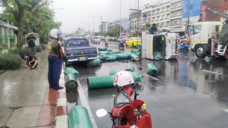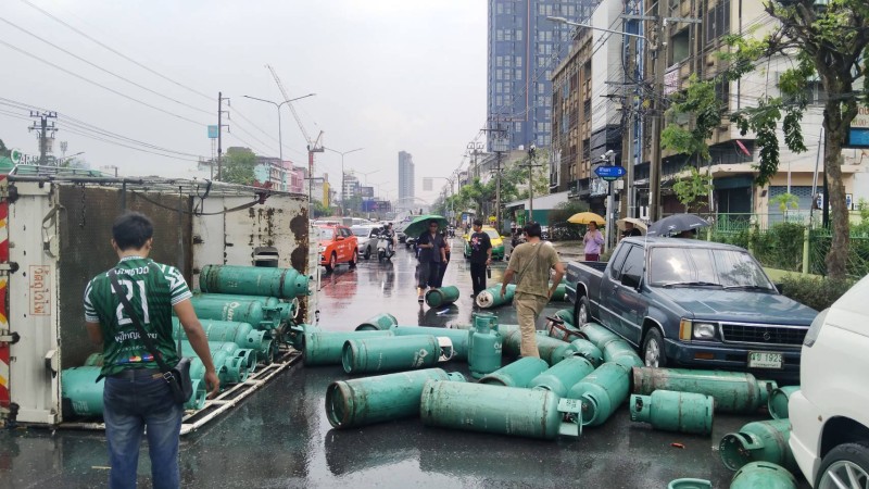 ที่เกิดเหตุพบรถบรรทุก 4 ล้อพลิกตะแคงอยู่กลางถนน โดยมีถังแก๊สหุงต้มขนาด 48 กิโลกรัม และ 15 กิโลกรัม ซึ่งเป็นถังเปล่าหล่นกระจัดกระจายเกลื่อนพื้น ส่งผลให้การจราจรติดขัดอย่างหนัก จากการตรวจสอบเบื้องต้นไม่พบแสงเพลิงหรือการรั่วไหลที่รุนแรง อย่างไรก็ตาม เจ้าหน้าที่ยังคงวางกำลังเฝ้าระวังอย่างใกล้ชิดเพื่อความปลอดภัยสูงสุด